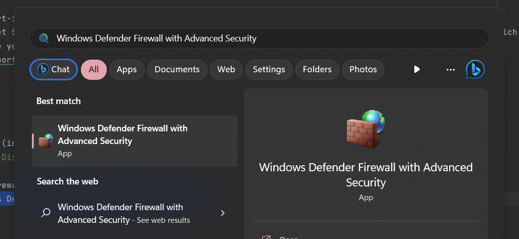 1. Search for "Windows Defender Firewall with Advanced Security" in the start menu, and open it. (Image)