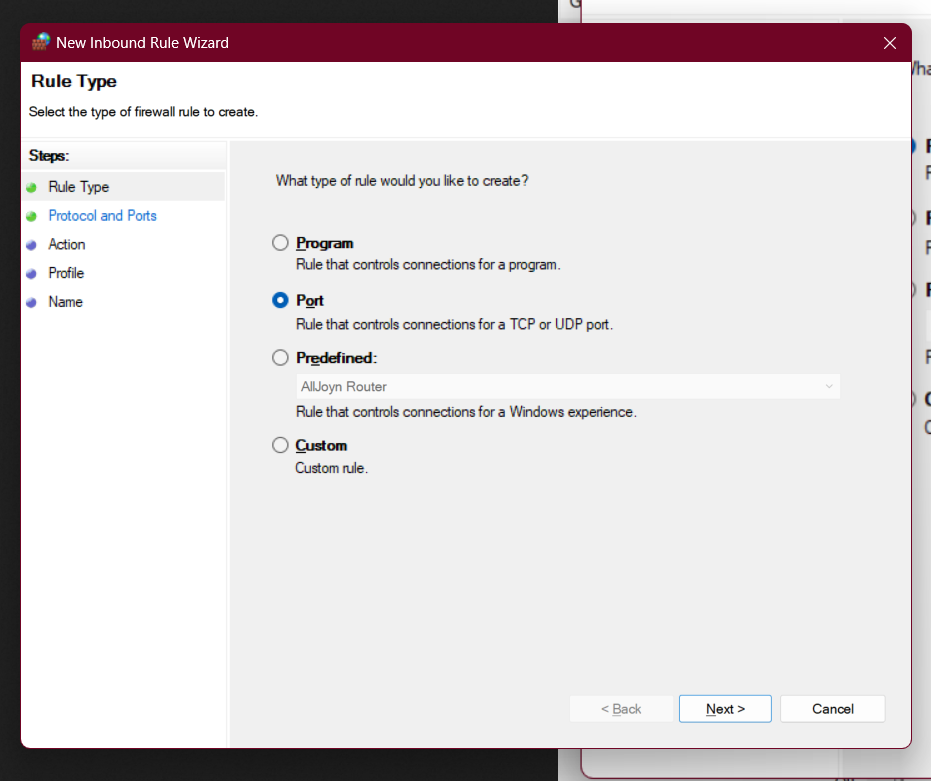 4. Select "Port" as the rule type and click "Next". (Example)