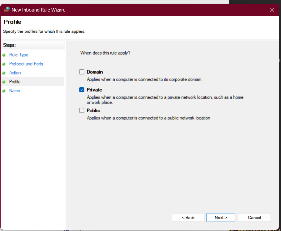 7. Select the profiles you want to apply the rule to (e.g. "Domain", "Private", "Public"), and click "Next". (Example)