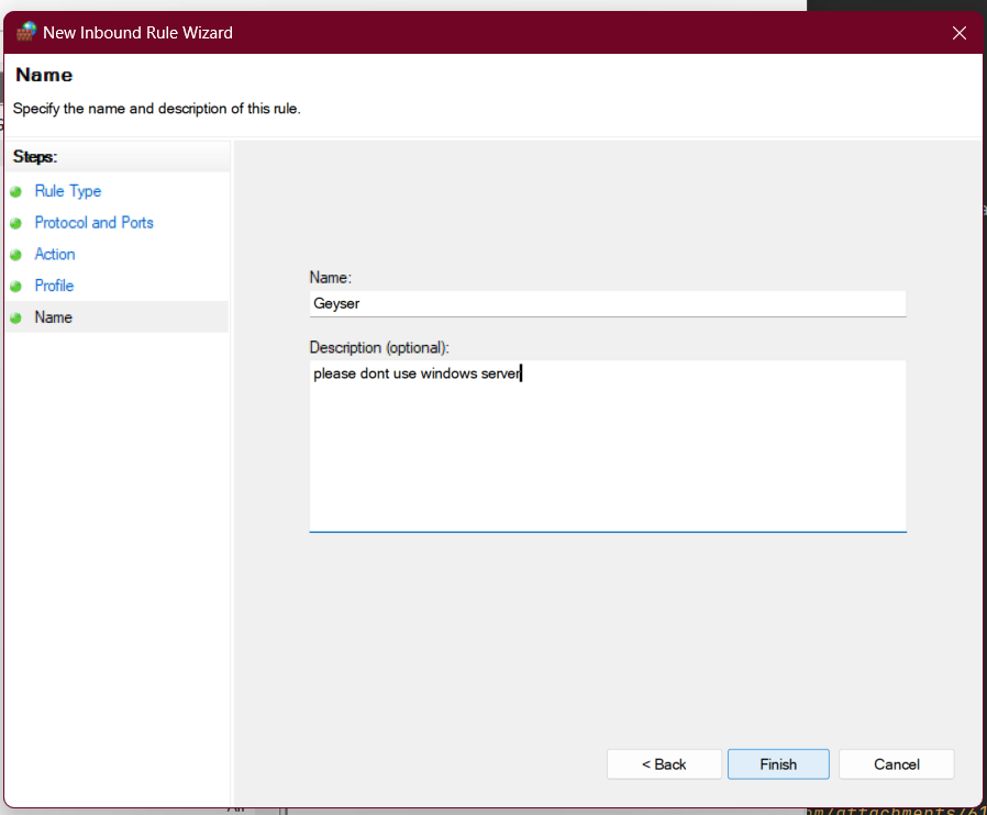 8. Enter a name for the rule (e.g. "Geyser"), and click "Finish". (Image)